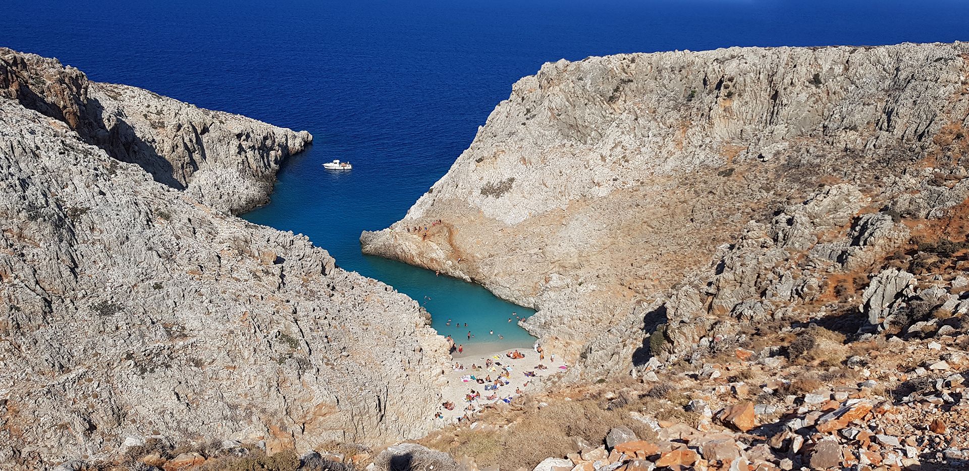 Stefanou beach is located at the position of Seitan Limania (i.e. satan harbours), 22km northeast of Chania and 2km east of the village Chordaki, at the east side of Akrotiri Cape. The wider area is named Seitan Limania, after the wild landscape, the steep cliffs and the strong sea streams which are considered dangerous. Here are situated three parallel narrow coves, well protected from the waves. In the northern cove a tiny fantastic beach is shaped, with deep azure waters, namely the beach of Stefanou. The beach has fine pebbles and sand, transferred there from the nearby quarry through the canyon Diplohahalo. On the right and the left sides of the cove, huge marble rocks are standing high to protect the beach from the bad weather. The fame of the beach has faced a rapid increase since 2010, some years after the asphalt road reached the place; the beach is crowded in during peak season. There is a narrow steep path starting from the parking place and leading to the beach, so make sure you wear sneakers.